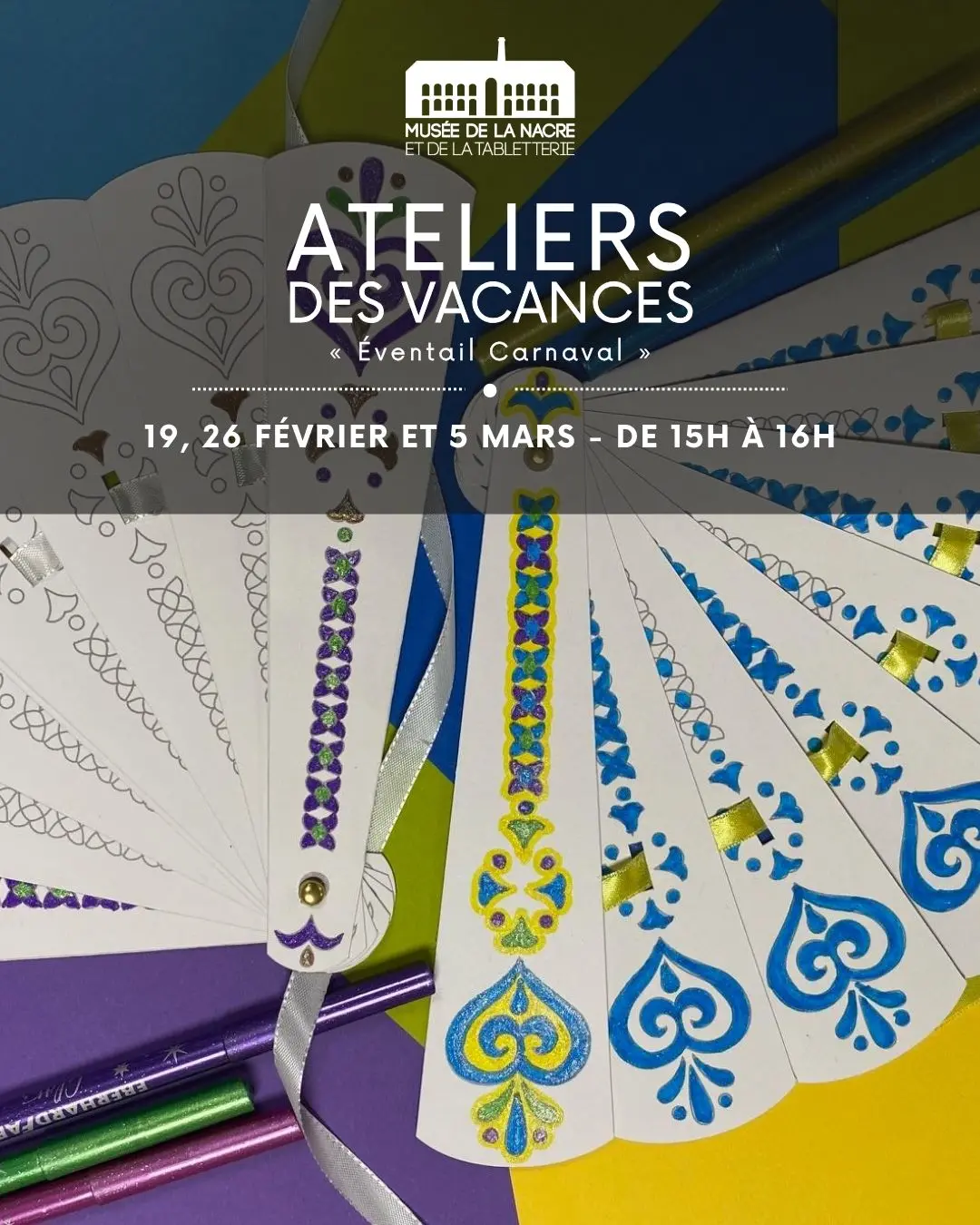 During the winter holidays, offer your children a fun and creative experience themed around Carnival. In this workshop, children will assemble and decorate their own cardboard fan. Colors, reflections, and patterns will come together to create a unique accessory, perfect for celebrating Carnival. The workshop is open to children aged 6 and up, whether alone or with their families. It's an ideal craft activity to develop creativity while sharing a friendly moment.