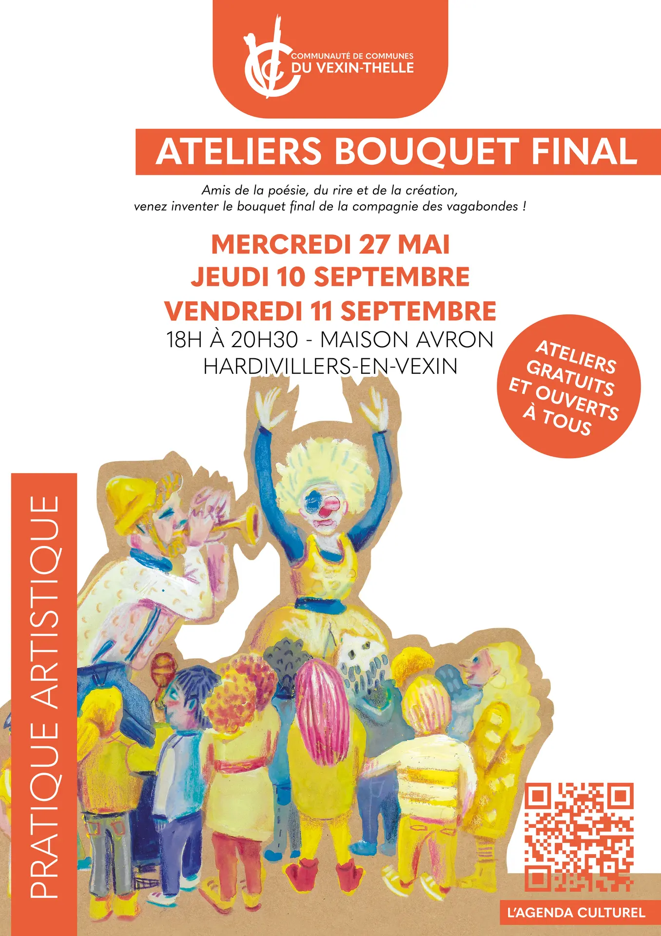 The Compagnie des Vagabondes is preparing its farewell celebration, its grand finale in the Vexin-Thelle region. Our fabulous clowns are looking for poetry, laughter, and creative enthusiasts to invent these unique moments with them. The workshops will allow you to create and rehearse through music, clowning, drawing, song, and writing: there's something for everyone. Don't hesitate to register, regardless of your age or experience. The workshops are followed by a potluck dinner.
